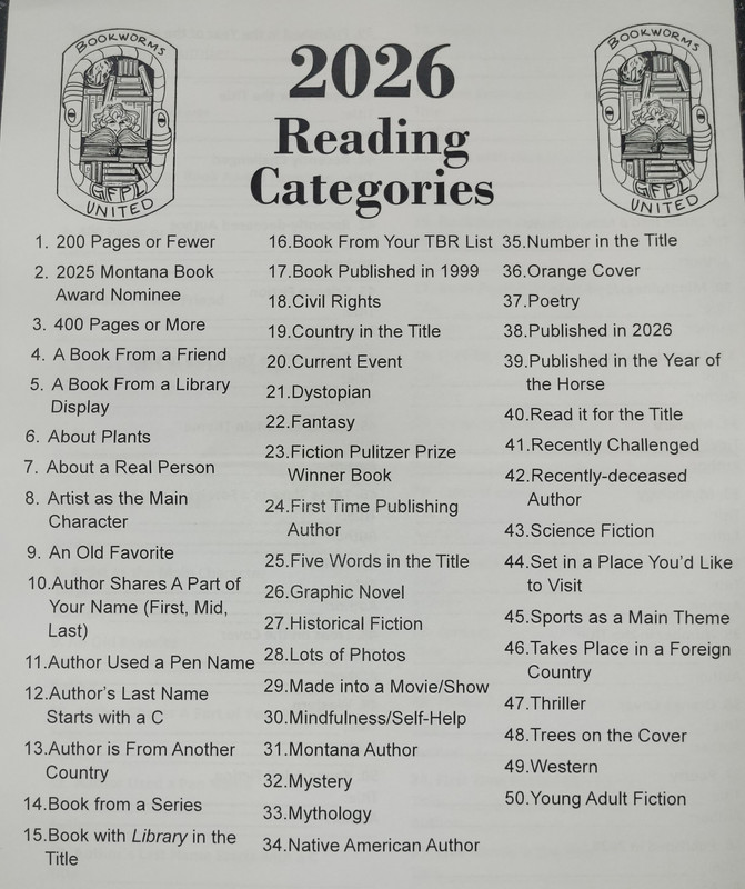 Instead of trying to manage 2 separate list here like I was gonna do last year, I'll share the challenges in case anyone wants to try them and just indicate on my actual book list the challenge I completed with it. Bookworms Challenge (in case anyone wants to try it...anything state specific can be changed to the state you live in if you want) 2026 Book List
