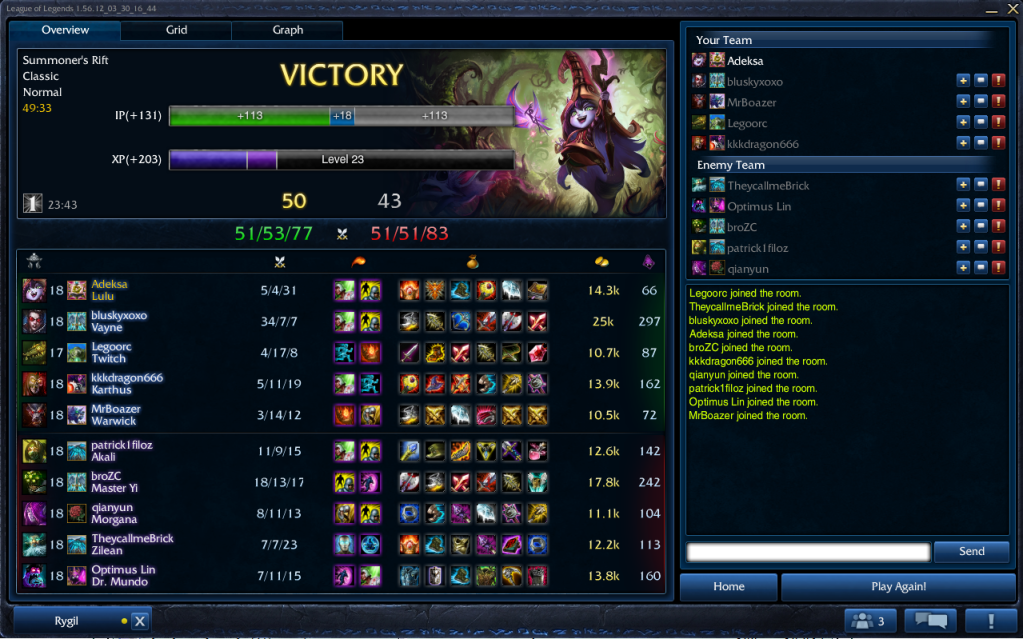 I totally just had a huge game full of epic assists. Two of my four deaths were caused trying to save teammates who rushed headlong into ganks. If I had realized that our Warwick was only level 12, I wouldn't have tried to save him as much as I did.